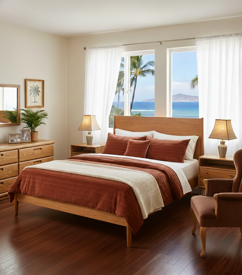 Affordable doesn't mean temporary. This bedroom uses solid, simple furniture pieces that totaled about $300 — sourced intentionally, shipped efficiently, and designed to last. This is the kind of approach I focus on for Maui homes rebuilding with real budgets.