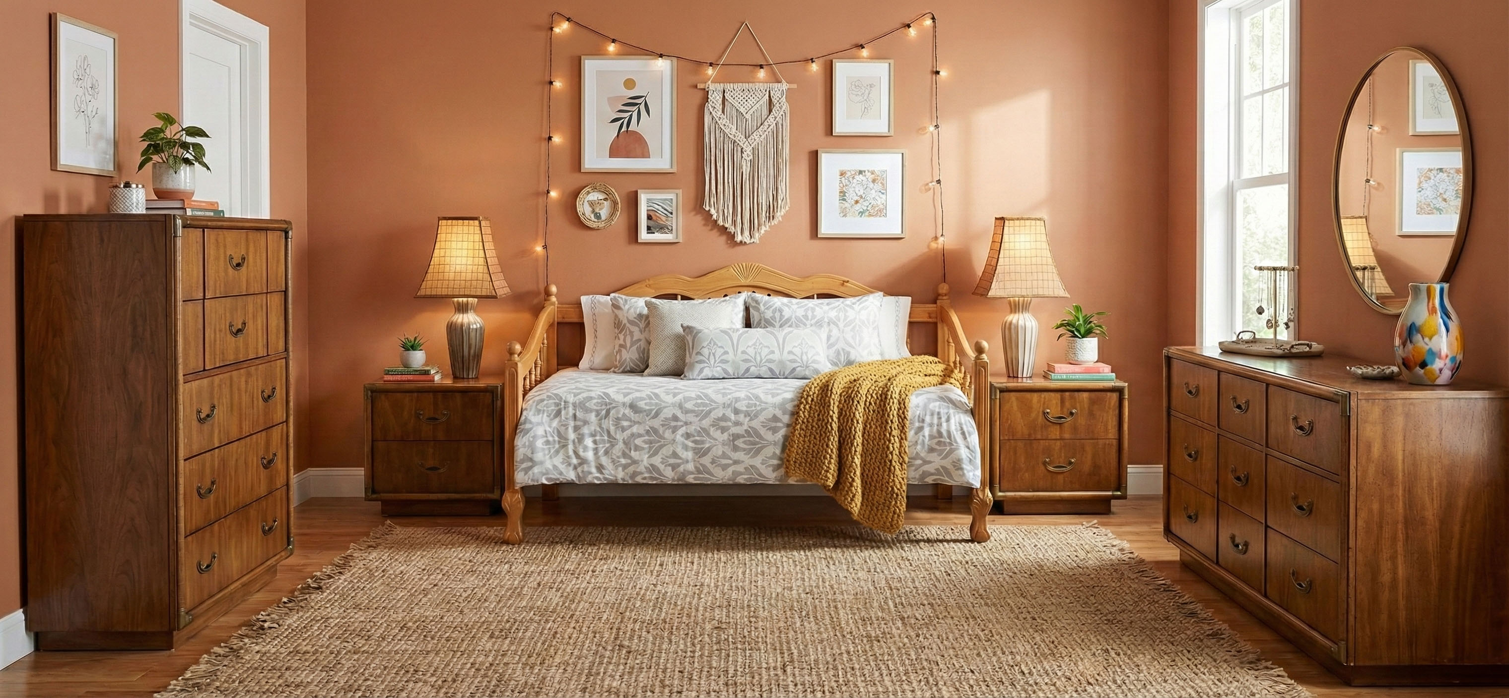 A high-end, soulful atmosphere on a budget under $500, featuring eclectic wall decor, rich wood grains, and ample storage. Bedding inspired by the Big Island collection by AveryLily.